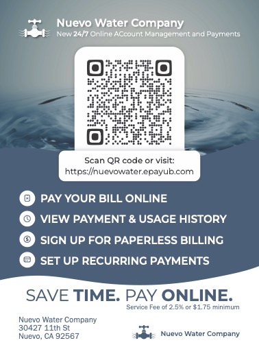 Nuevo Water Company (NWC) was formed as a Mutual Non-Profit Corporation in 1913 to provide water to farms and homes in the Nuevo and Lakeview area and is owned by you, our Shareholders. Over the last 111 years the Company has evolved from being predominantly an irrigation water system, to becoming a community water supply system. NWC now serves water to more than 1900 homes and businesses in the valley and delivers it through more than 46 miles of pipeline.